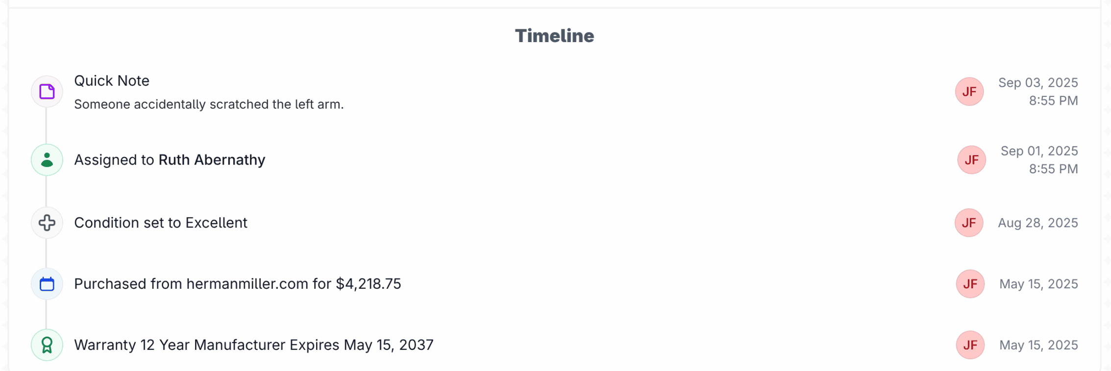 The timeline documents the complete lifecycle of each asset from purchase through events, to-dos, repairs, maintenance, and notes, to final sale or retirement. Every activity is recorded in one place, and each timeline entry can be edited with a single click.