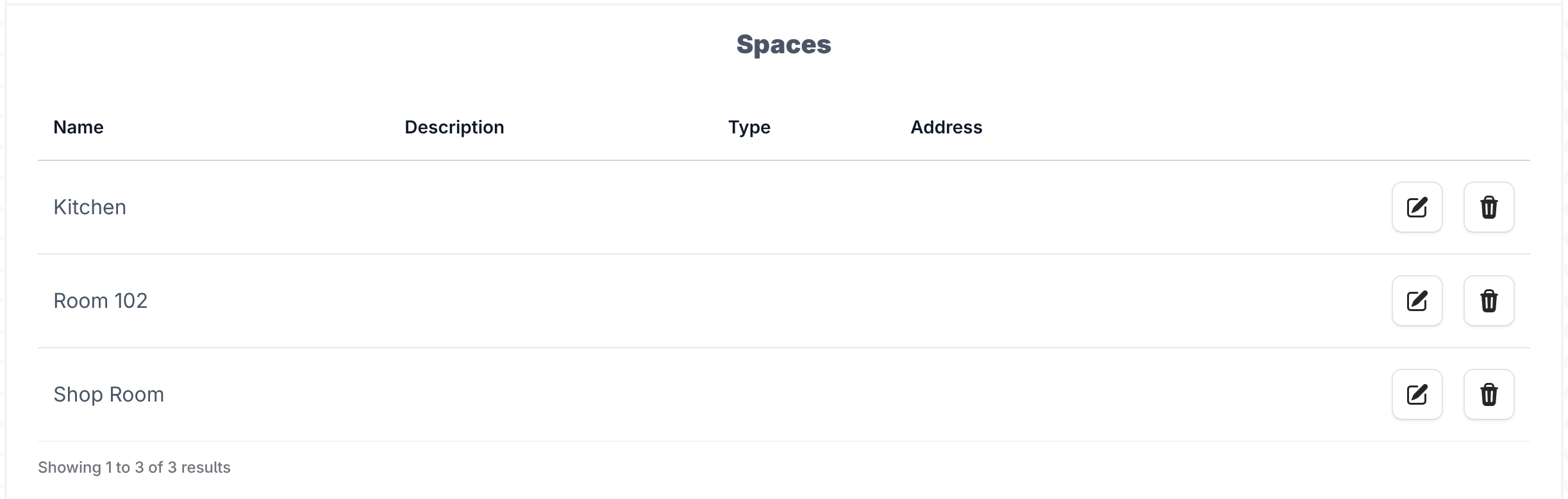 If you add spaces to the location in the actions button, the Spaces section will appear below the current assignments. Spaces are essentially sub locations inside a location. They can be anything from a room, to a space, to a floor or anything else. Spaces can be assigned to other resources allowing more granularity on where an asset is for example.
